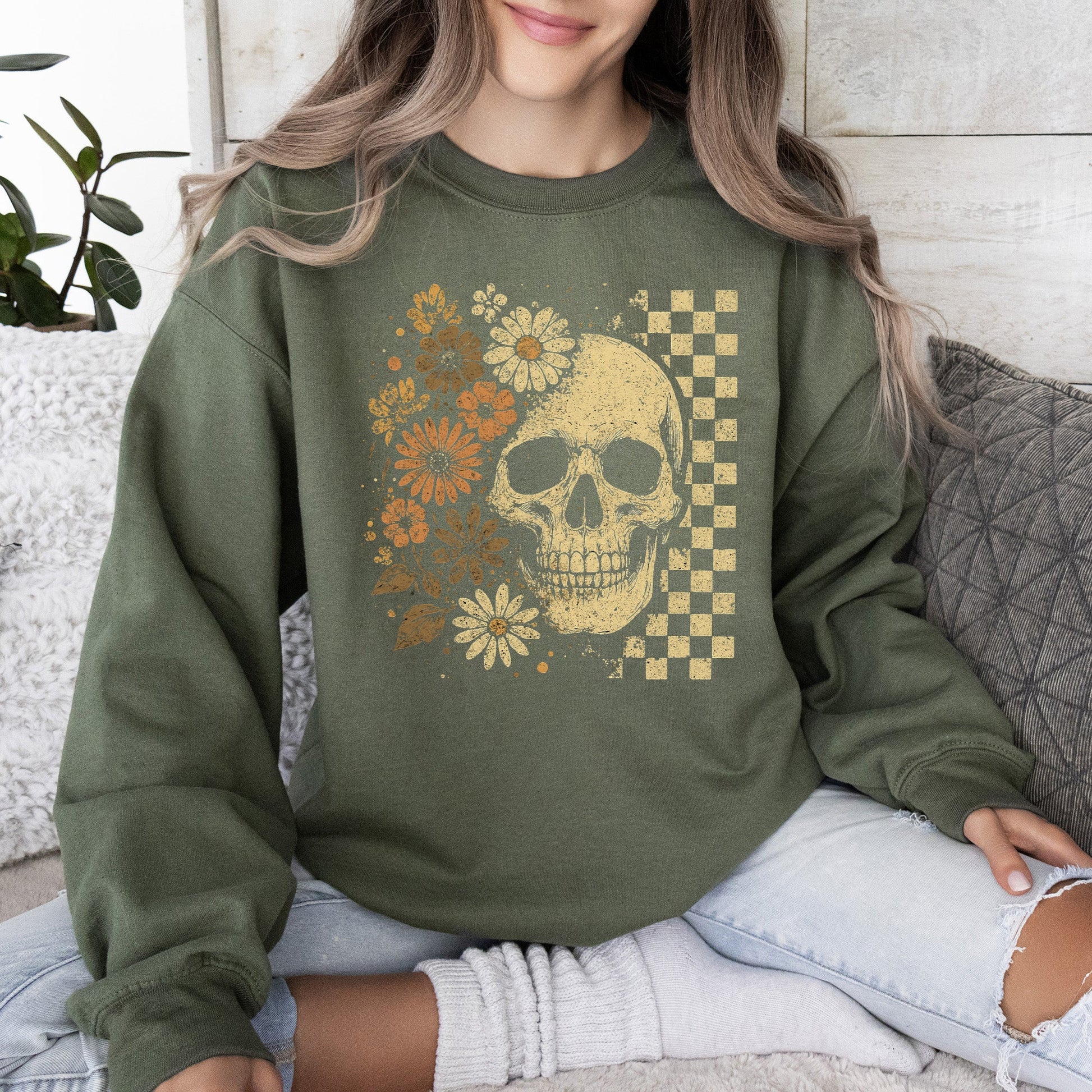 Vintage Skull, Floral, Checkered, Ghost, Halloween, Book, Cat, Western, Pumpkin, Retro, Spooky, Costume, Fall, Graphic Sweatshirt