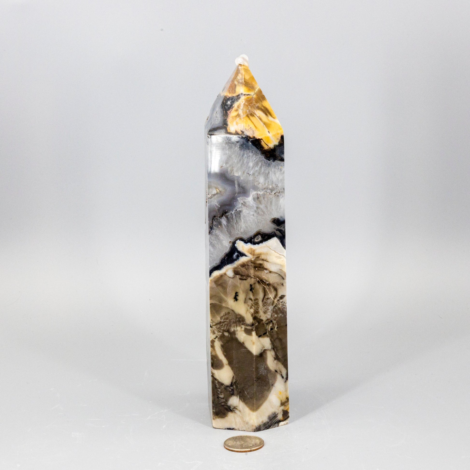 This Volcano Agate Crystal Tower – XL UV Reactive is a striking natural stone with rich volcanic patterns that glow under UV light, making it a unique and captivating centerpiece. Polished into a tall tower shape, it’s perfect for meditation, energy work, or as a decorative display.