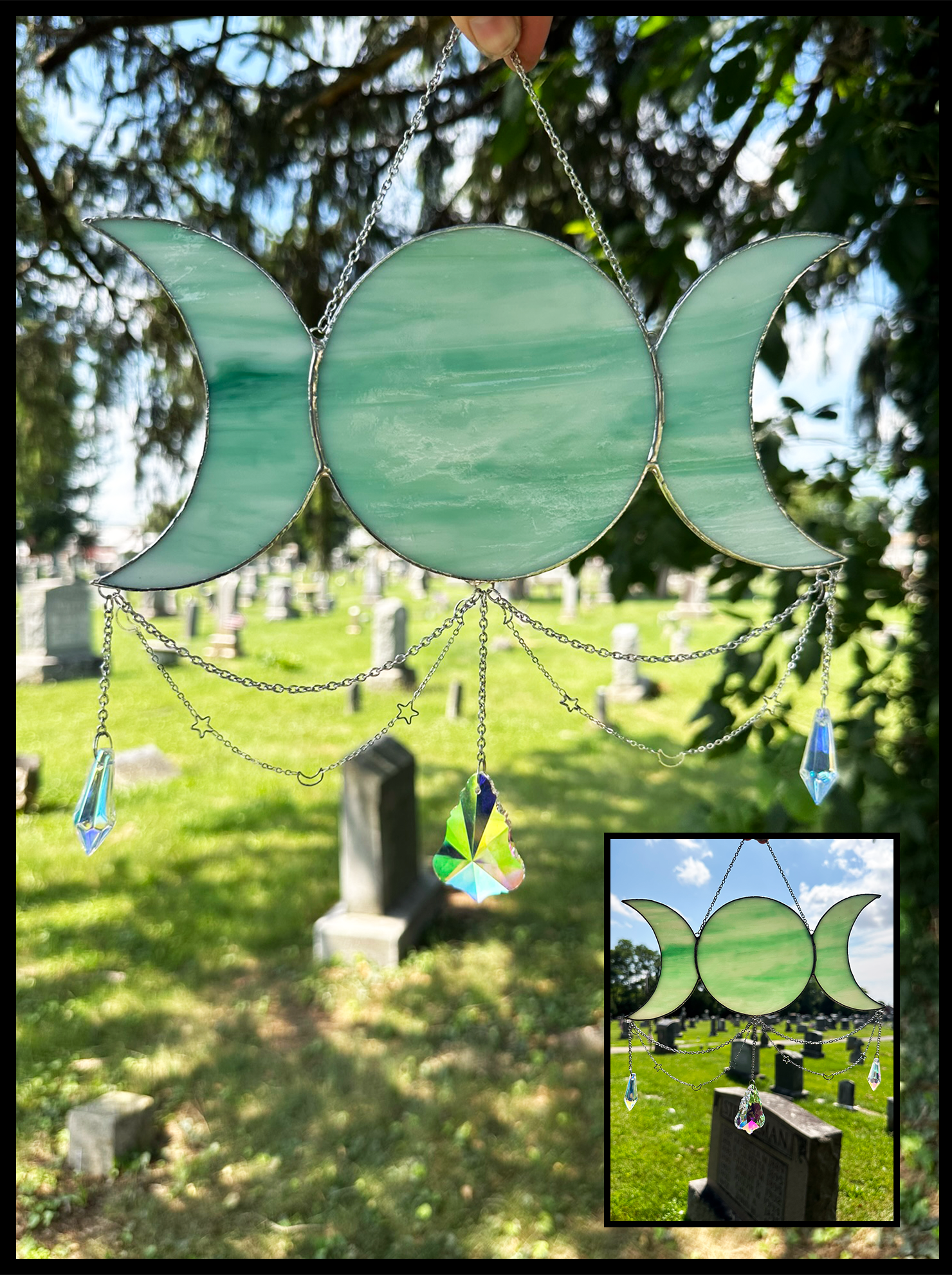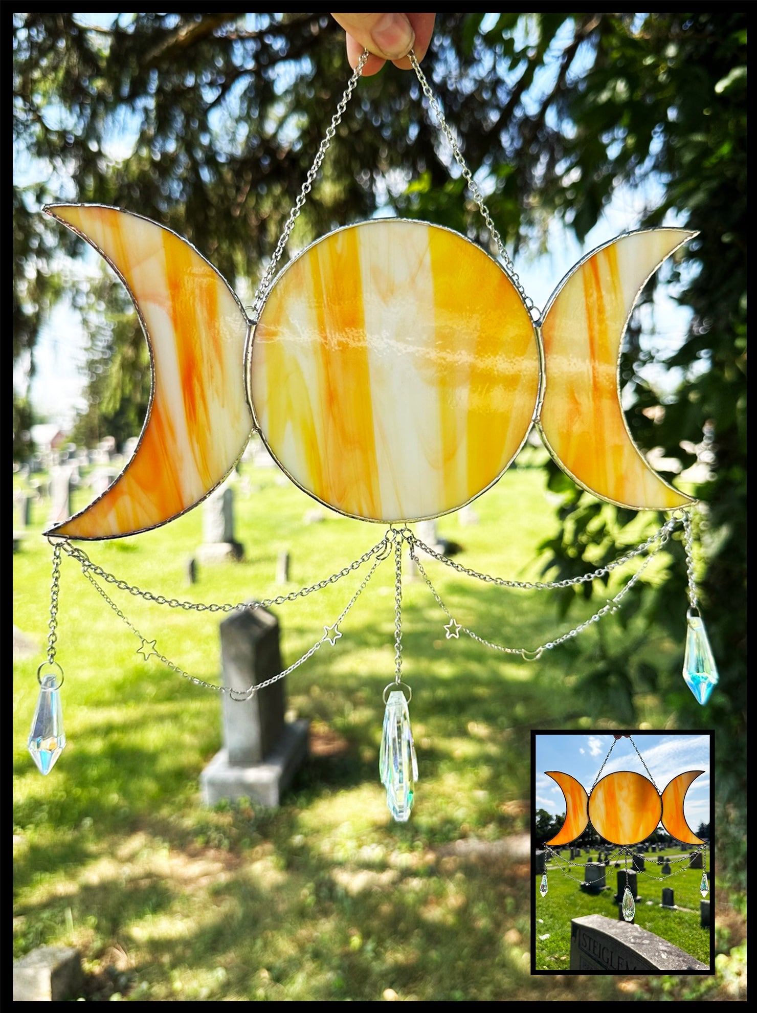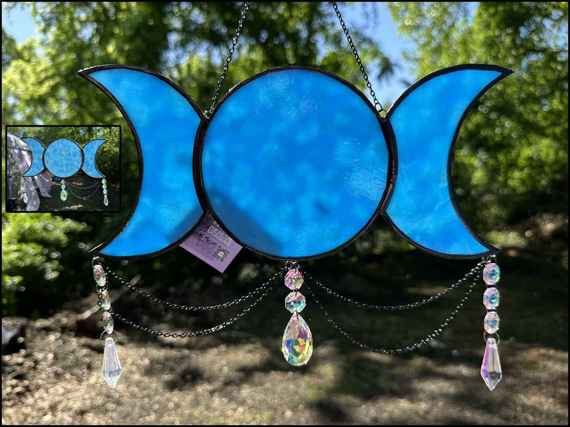 Bring a little magic to any interior with this enchanting stained glass Triple Moon sun catcher. Hang it in your windows and let its three crescent moons bring a touch of celestial light into your home!