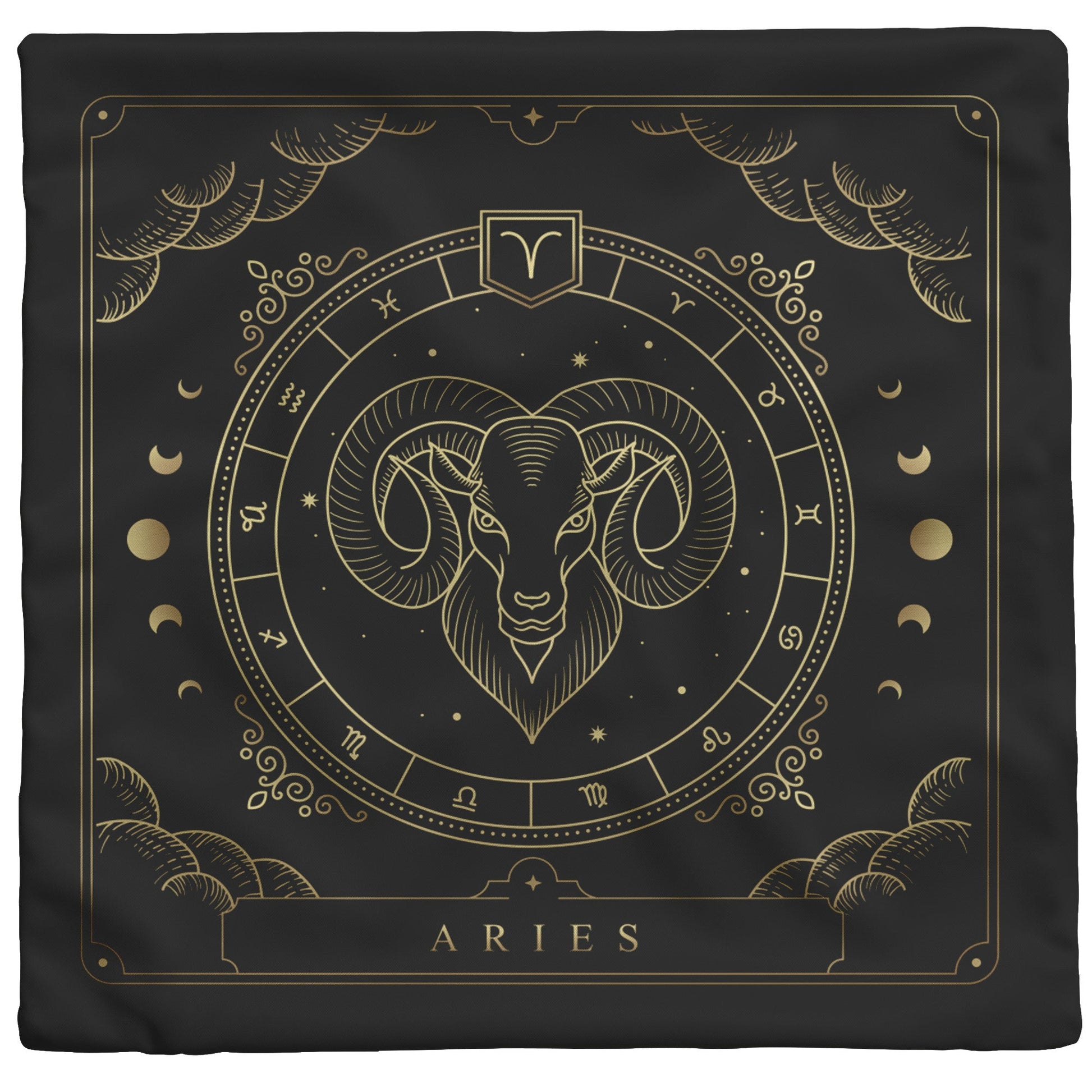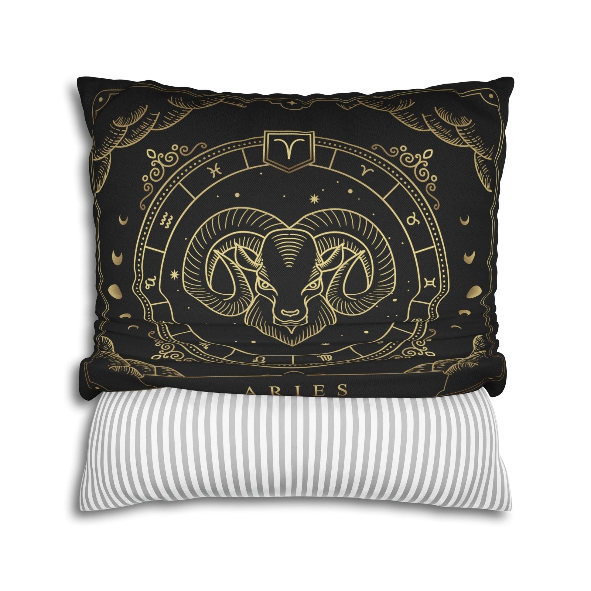Add some flair and comfort to your home with this chic and cozy throw pillow. This pillow features the zodiac symbol of Aries, the ram, in a tarot-inspired design in gold artwork on a black background.