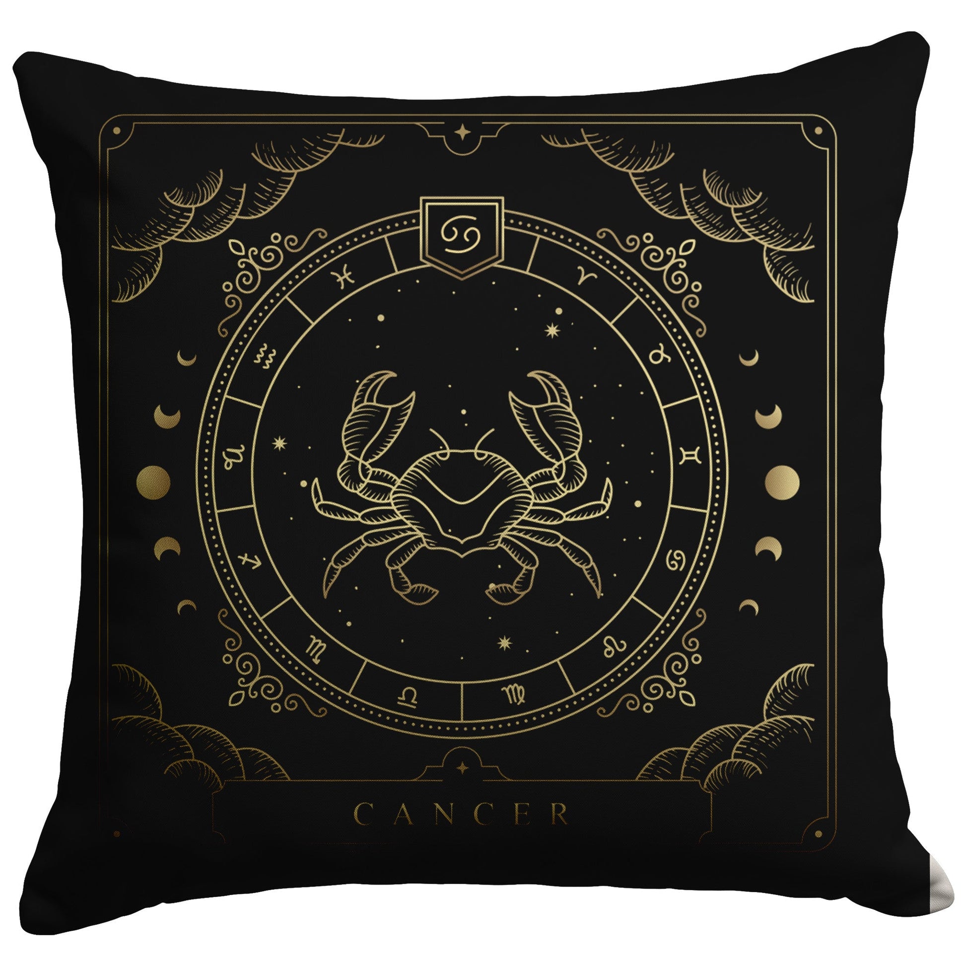 Create a cozy and inviting atmosphere with this lovely and soft throw pillow. This pillow features the zodiac symbol of Cancer, the crab, in a tarot-inspired design in gold artwork on a black background.