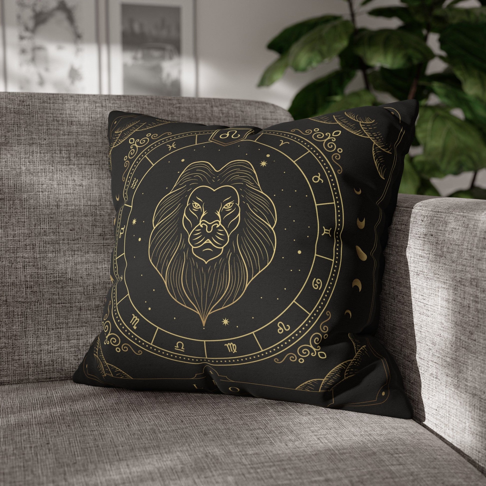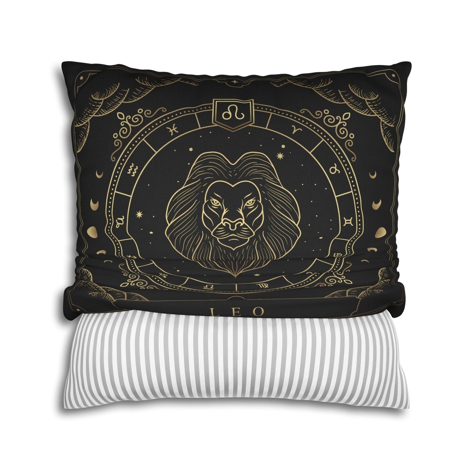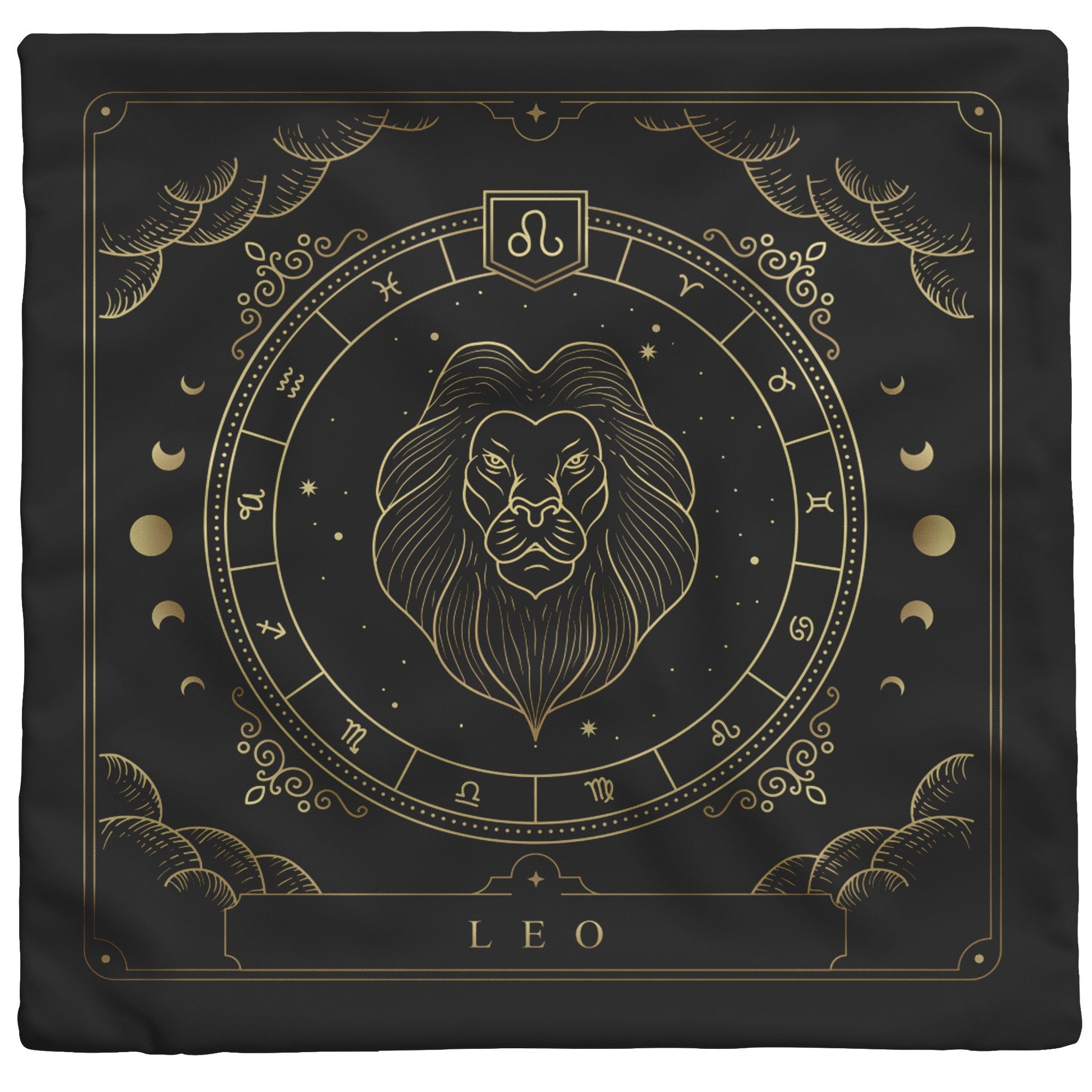 Make a statement with this bold and cozy throw pillow. This pillow features the zodiac symbol of Leo, the lion, in a tarot-inspired design in gold artwork on a black background