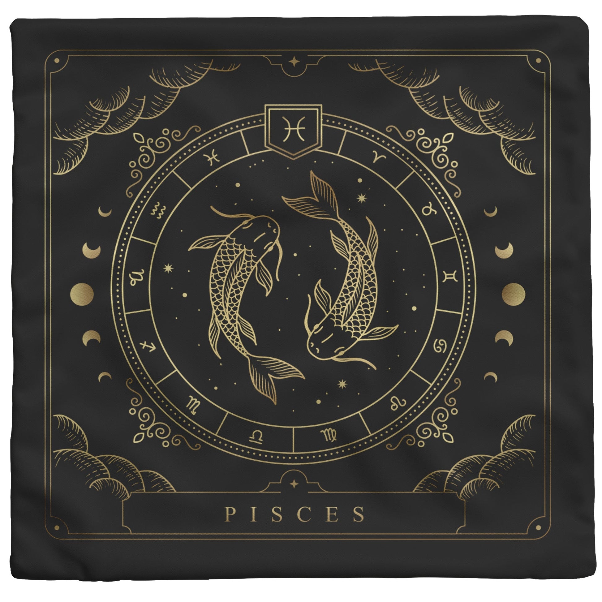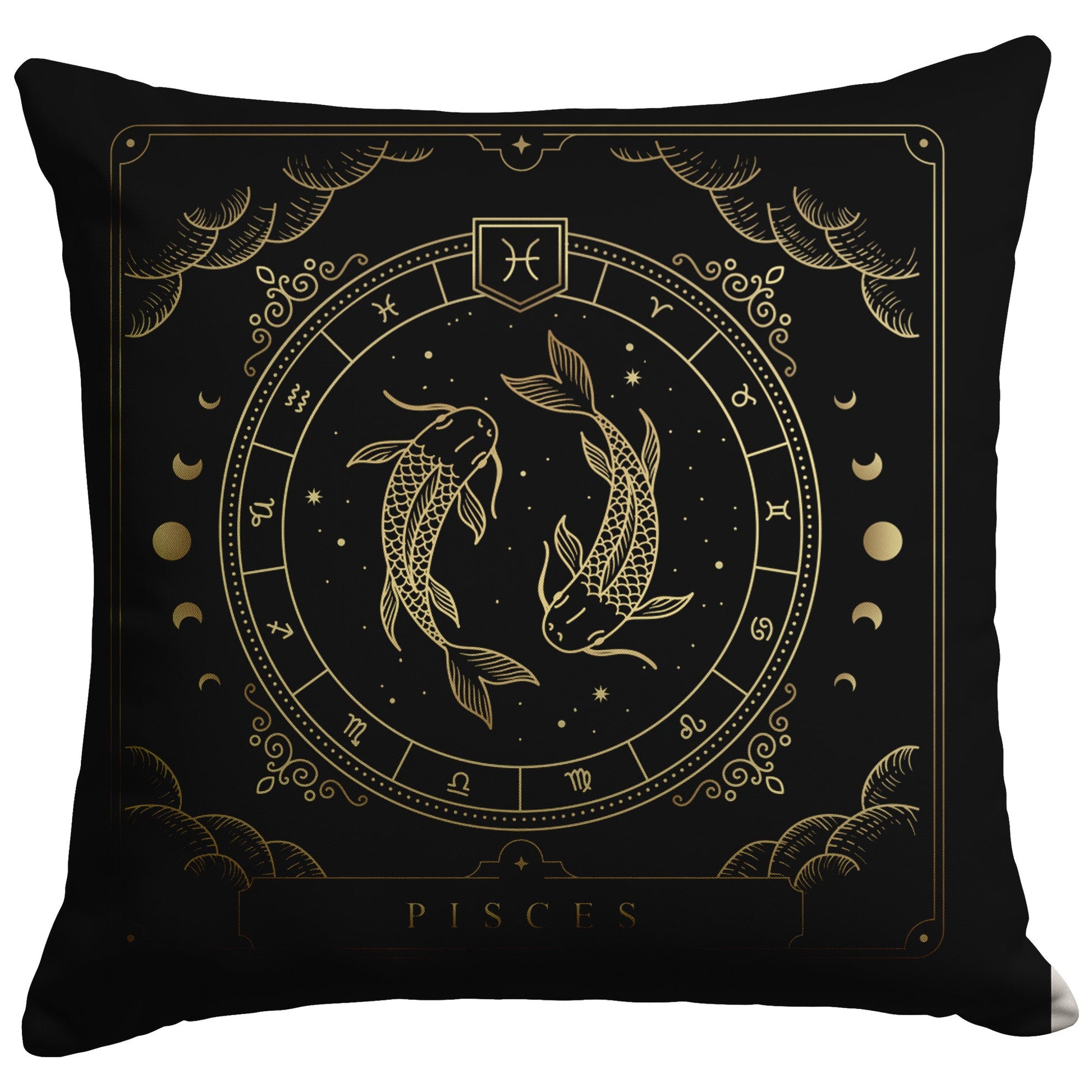 Add some dreaminess and compassion to your home with this lovely and cozy throw pillow. This pillow features the zodiac symbol of Pisces, the fish, in a tarot-inspired design in gold artwork on a black background.