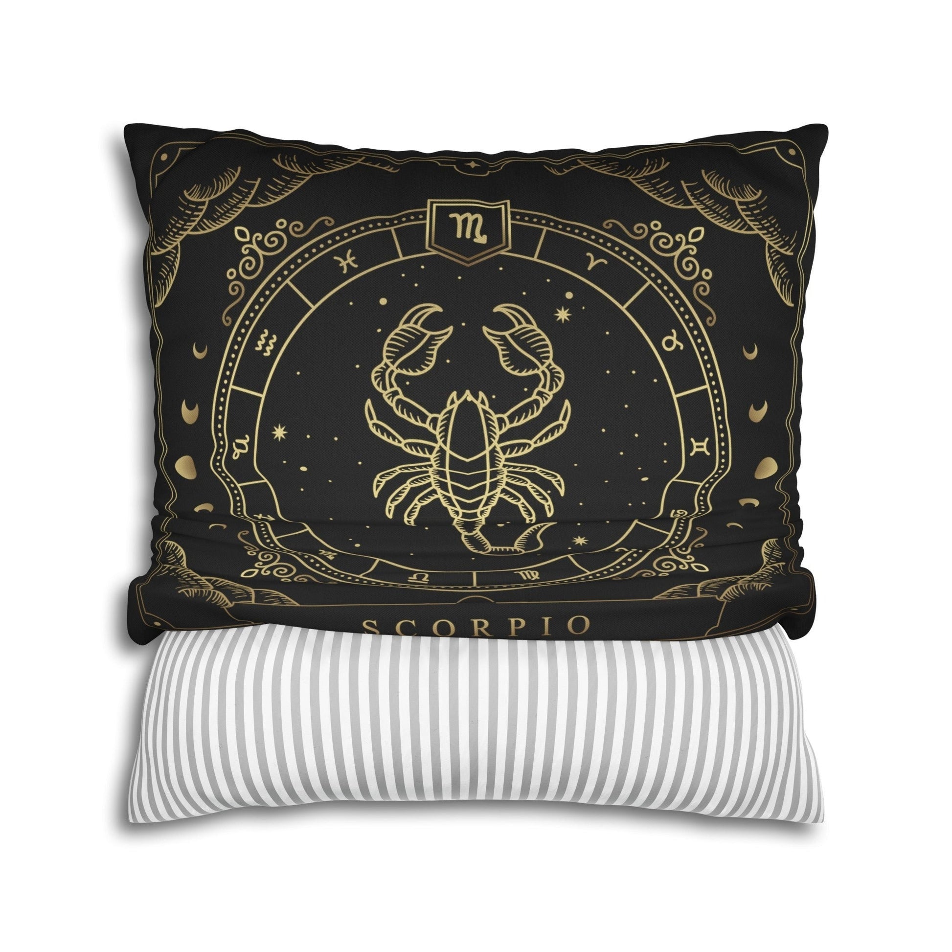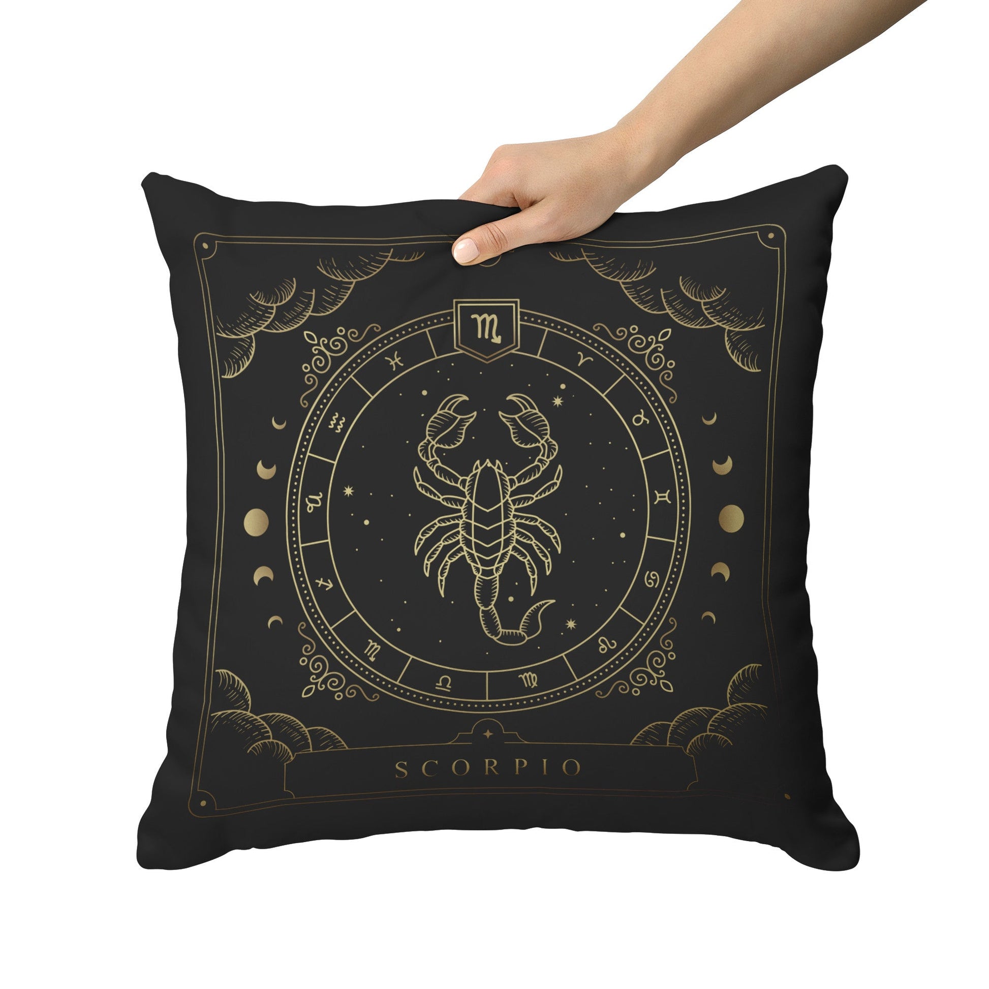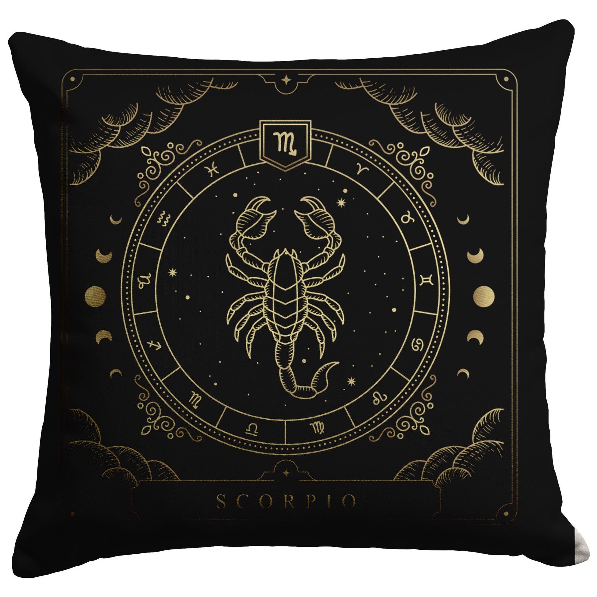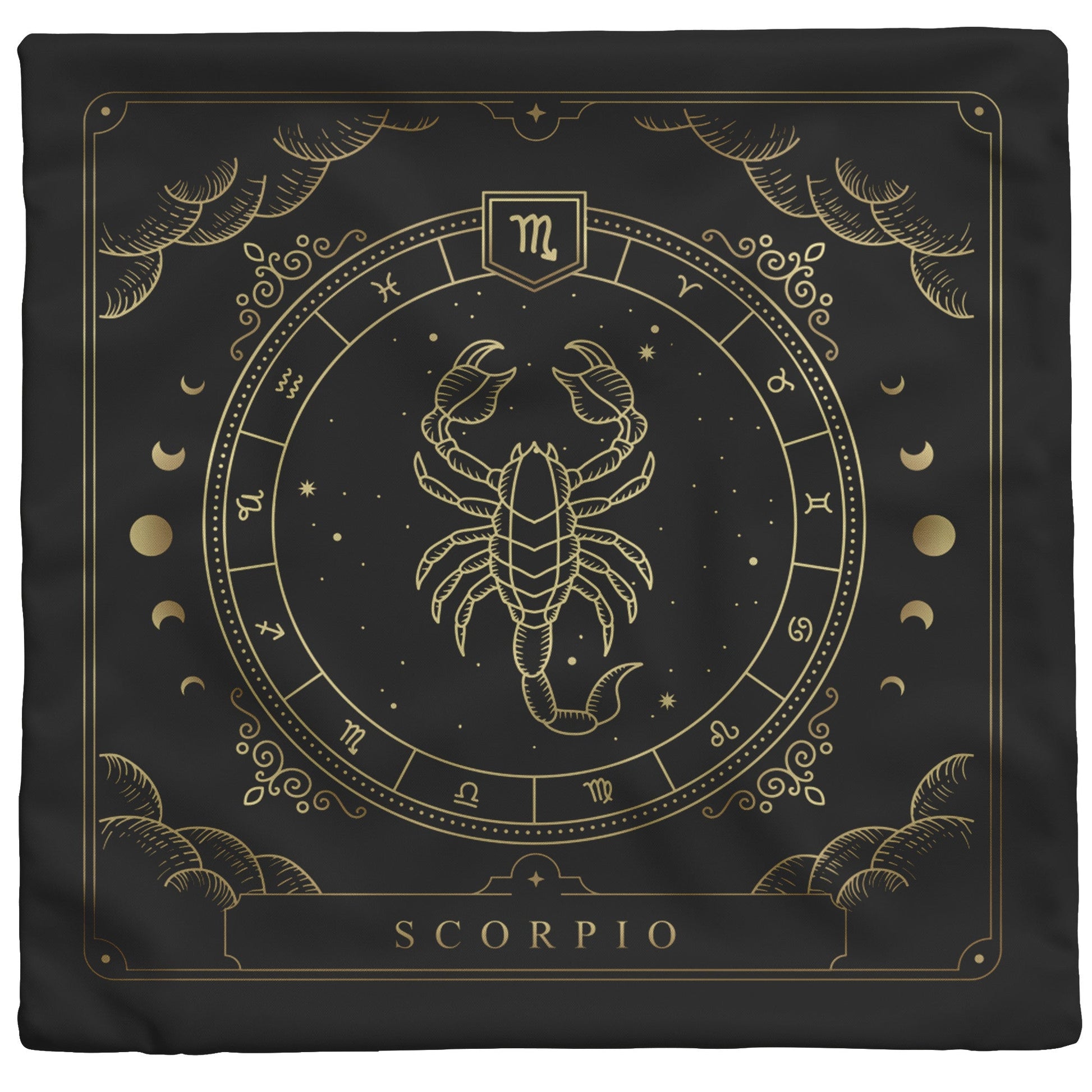 Add some mystery and intensity to your home with this stunning and cozy throw pillow. This pillow features the zodiac symbol of Scorpio, the scorpion, in a tarot-inspired design in gold artwork on a black background.